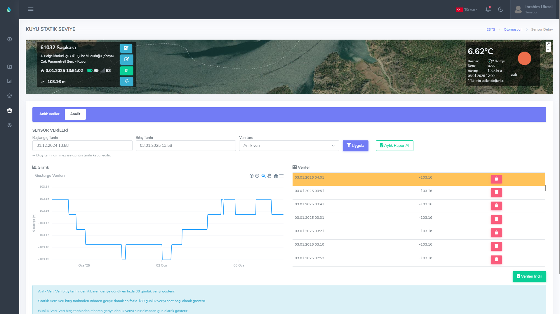 Toplanan veriler, hem görsel hem de sayısal olarak işlenir ve sistem, anlık veri takibi ve karşılaştırmalı grafikler oluşturur. Bu raporlar, su seviyesi, sıcaklık ve iletkenlik (EC) gibi üç temel parametreye göre ayrıntılı şekilde analiz edilebilir. Raporlar, çeşitli formatlarda alınabilir ve kullanıcıya sunulabilir.Sistemdeki her bir ölçüm noktası için alarm eşikleri belirlenebilir. Örneğin, su seviyesi kritik bir seviyeye ulaştığında veya tuzluluk (EC) değeri yükseldiğinde, sistem anında uyarı gönderir. Bu alarm, e-posta, SMS gibi farklı kanallar üzerinden ilgili yetkililere iletilir. Bu sayede, acil durumlarda hızlı ve etkili müdahale mümkün hale gelir. Ayrıca, veri analizi sonucunda elde edilen bilgiler ışığında, yıllık, aylık veya günlük raporlar oluşturulabilir.